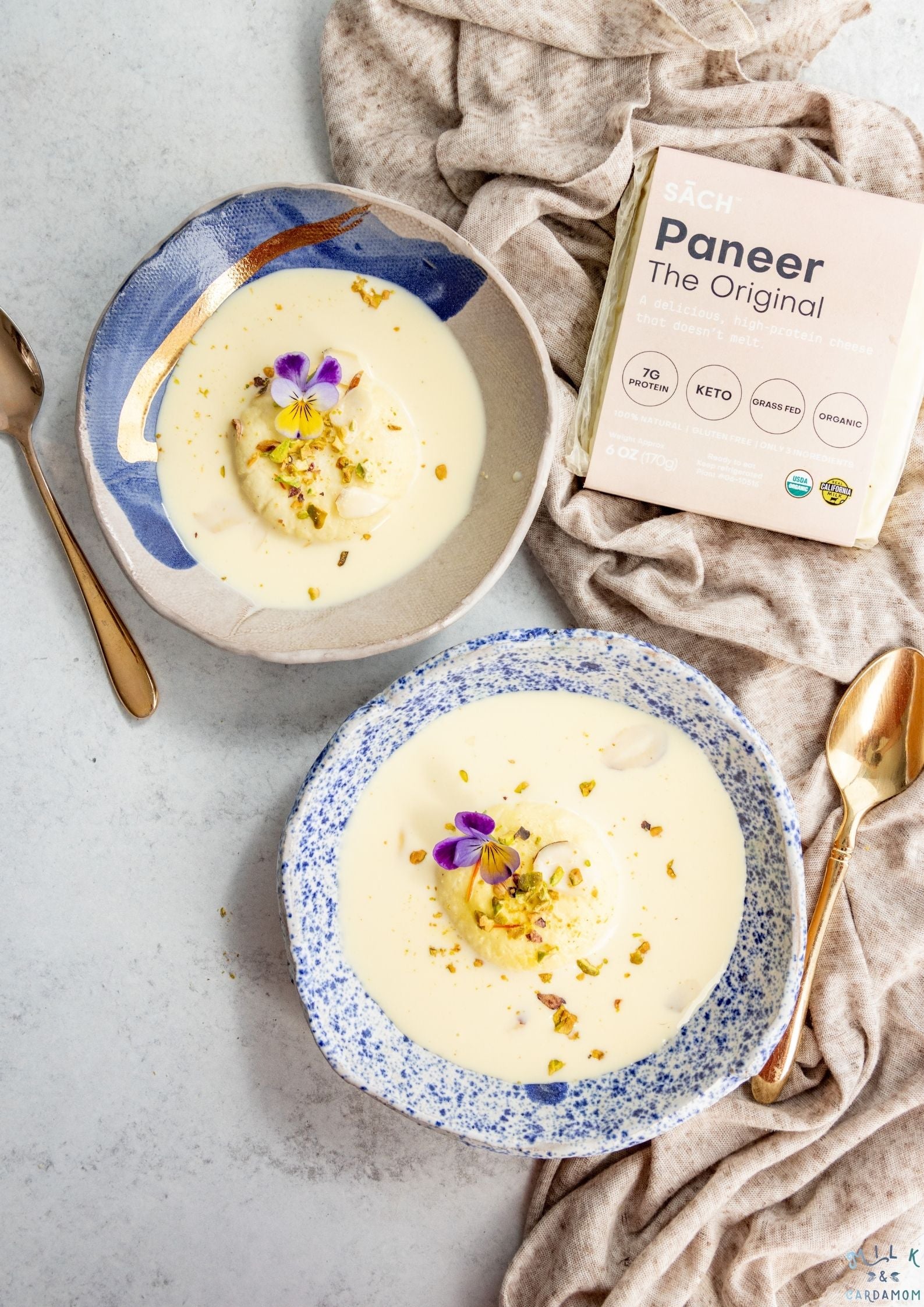- Gently pick up the cooled paneer and lightly squeeze to get rid of any excess syrup and add to the milk mixture.