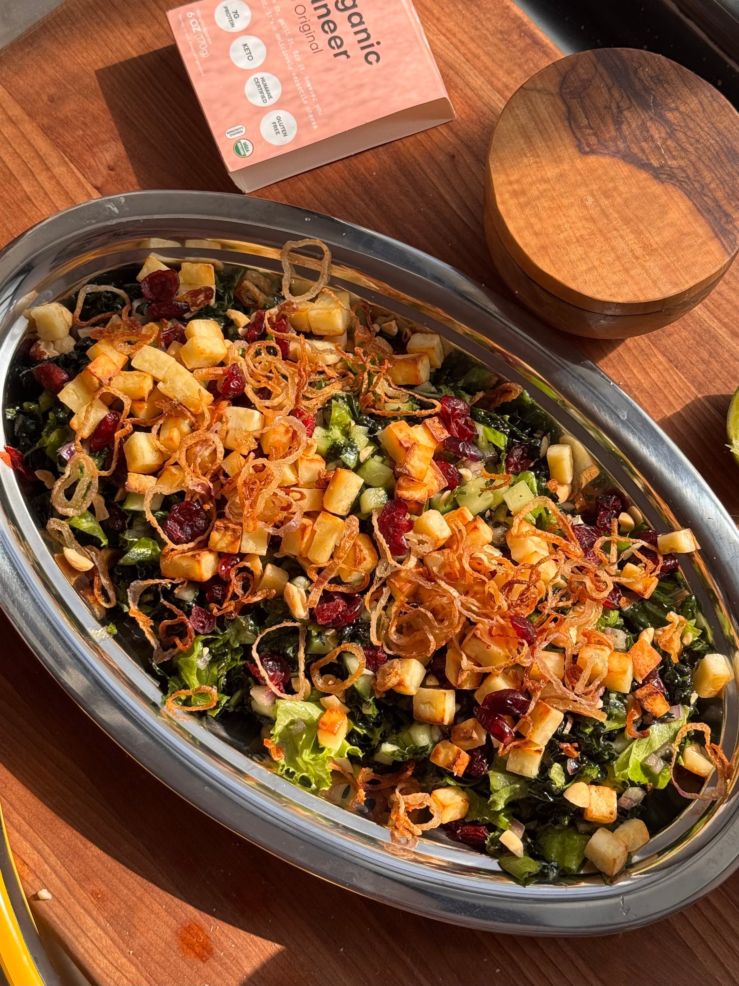 Transfer to a serving plate and finish with your crispy paneer, pomegranate, peanuts, and fried shallots.