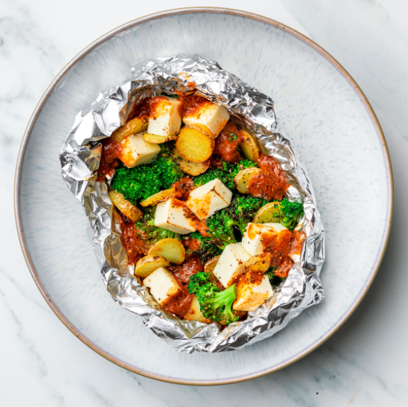 Sliced fingerling potatoes, cubed paneer, and crispy broccoli - all covered in Maya Kaimal's delicious Tikka Masala Simmer Sauce cooked in a foil packet.