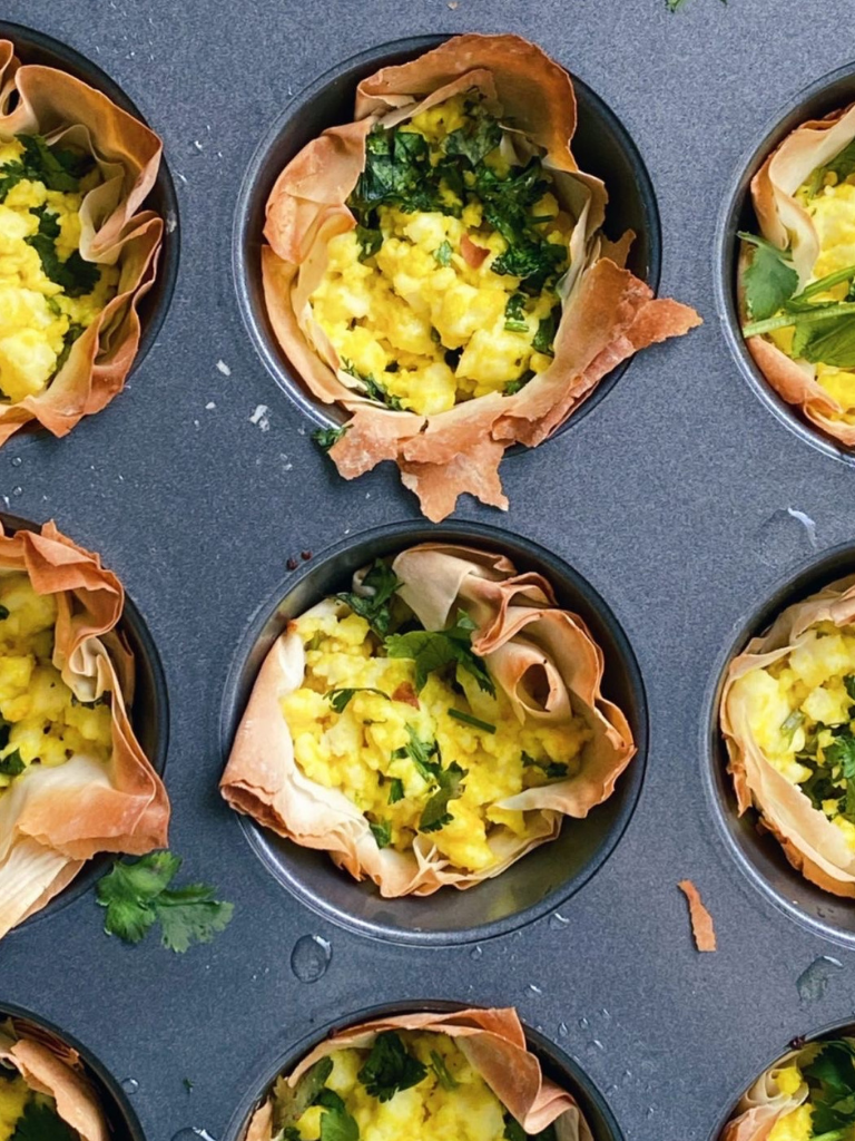 - Tear the fillo dough roughly – and line each cupcake pan slot with it.