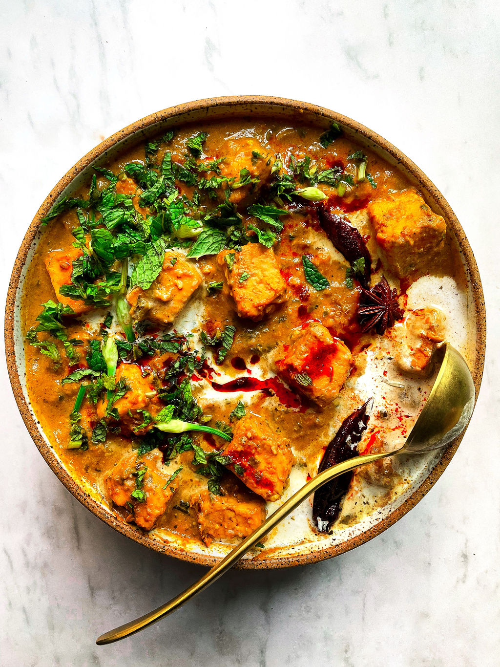 - Add the saffron infused water and the fried paneer cubes. Mix well and turn the heat to low, partially cover and let it cook on low heat for 10-12 minutes, stirring occasionally. Add hot water if the curry thickens