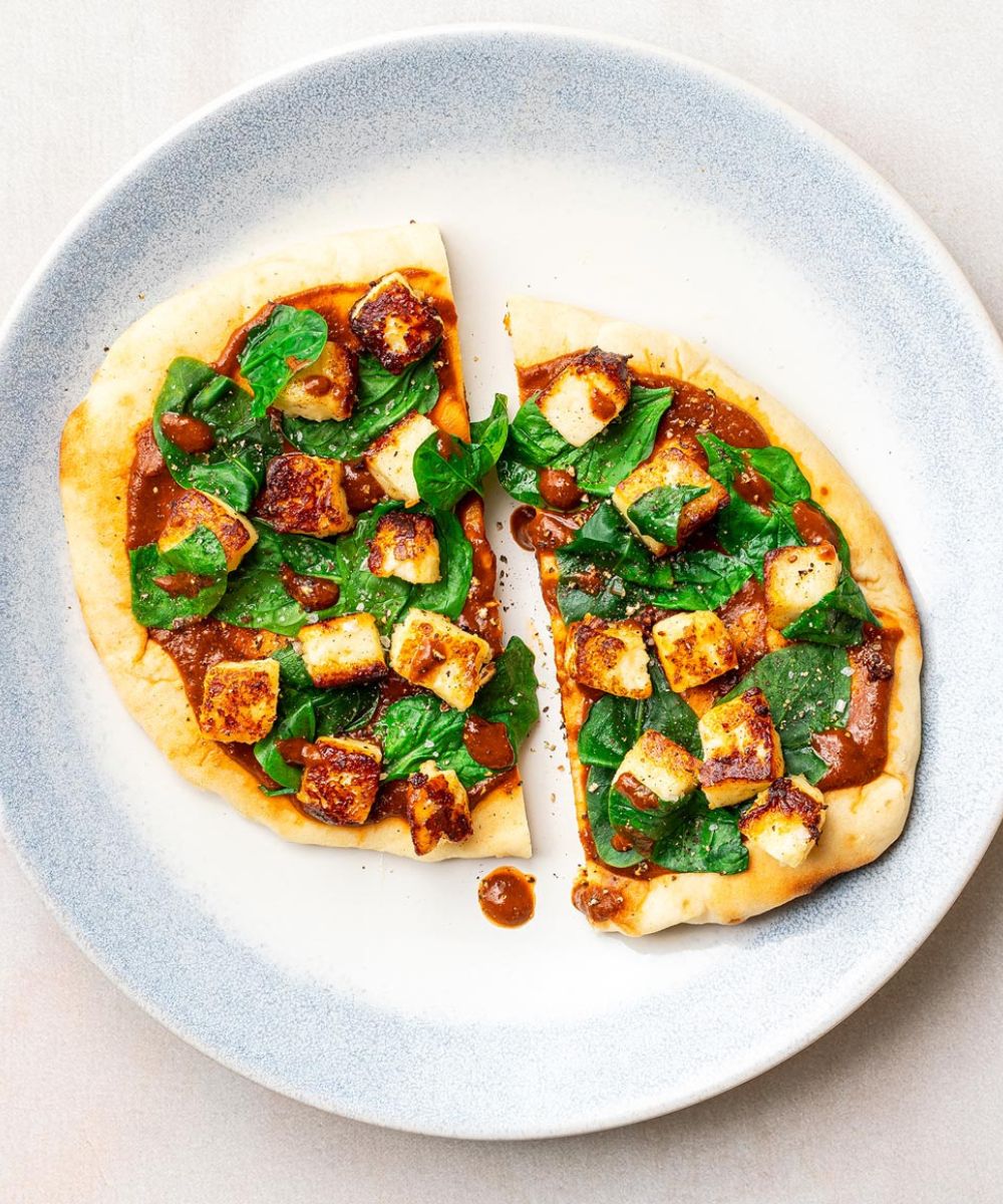 Spread sauce onto naan, layer with spinach and paneer; bake 5-7 min until naan is crispy and hot, then slice in half!