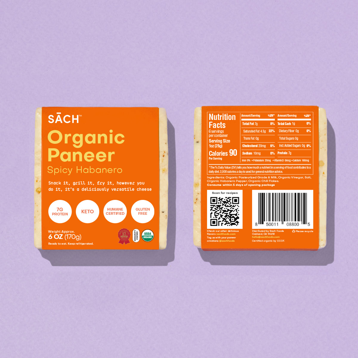 Our love for spicy food inspired us to make a spicy habanero version of our paneer. We balance out the heat from the raw habanero peppers with delicious, sustainably sourced organic milk. You'll feel and enjoy the heat. Some great ways to use it include taco toppings, pizza toppings, and mixing it in with your scrambled eggs. All our milk is sourced from humane-certified farms.
